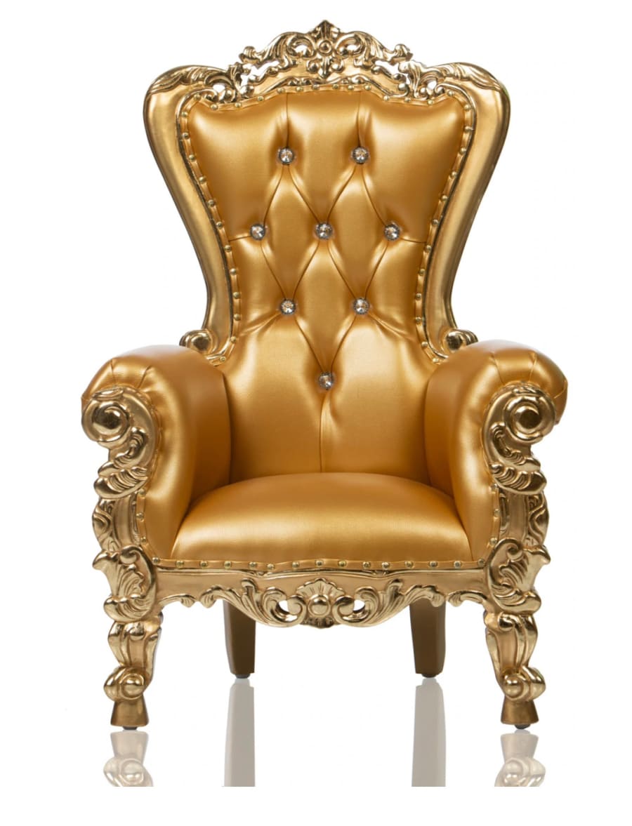 This is a kid's mini-throne chair that's solid gold in color. This chair is great for kids birthdays.