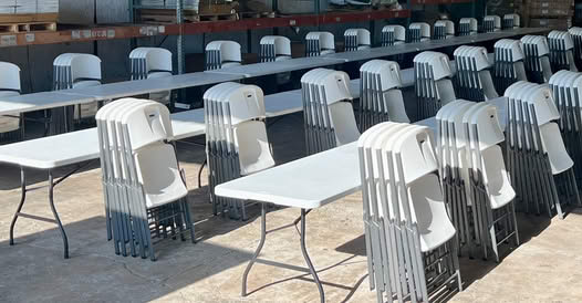 Deliver a clean, coordinated look for meetings, parties, and ceremonies with the Event Rentals # 3 - Table & Chair Combo (50 people) in your area. This reliable setup includes 6 rectangular tables and 50 heavy-duty folding chairs, all in crisp white. Perfect for corporate events, community gatherings, rehearsal dinners, and backyard celebrations. 🎉
